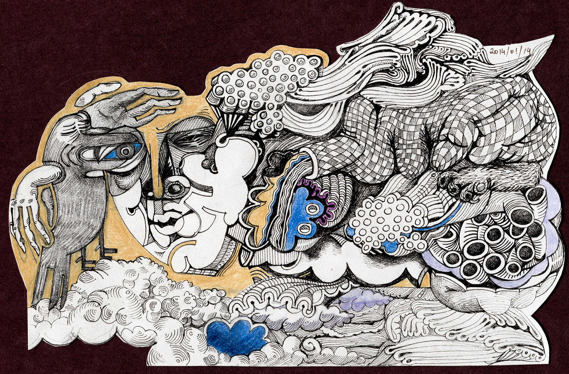 Doodles with a Craw and Cheeseburger-Eye Face, finished 2016. Micron pen, graphite and color pencils